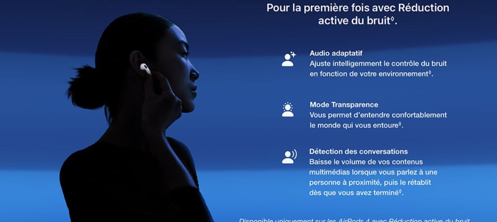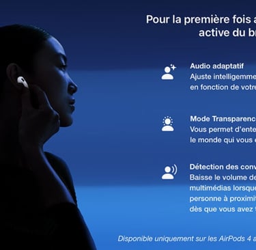 Pour ceux qui souhaitent profiter d'une immersion sonore complète, le suivi dynamique des mouvements de la tête permet d'expérimenter un audio spatial personnalisé, créant une sensation de profondeur et d'espace autour de vous. Nouvelle référence en matière d'écoute sans fil, les Apple AirPods 4 s'adaptent à la réalité d'aujourd'hui, en répondant aux exigeants utilisateurs d'audio.